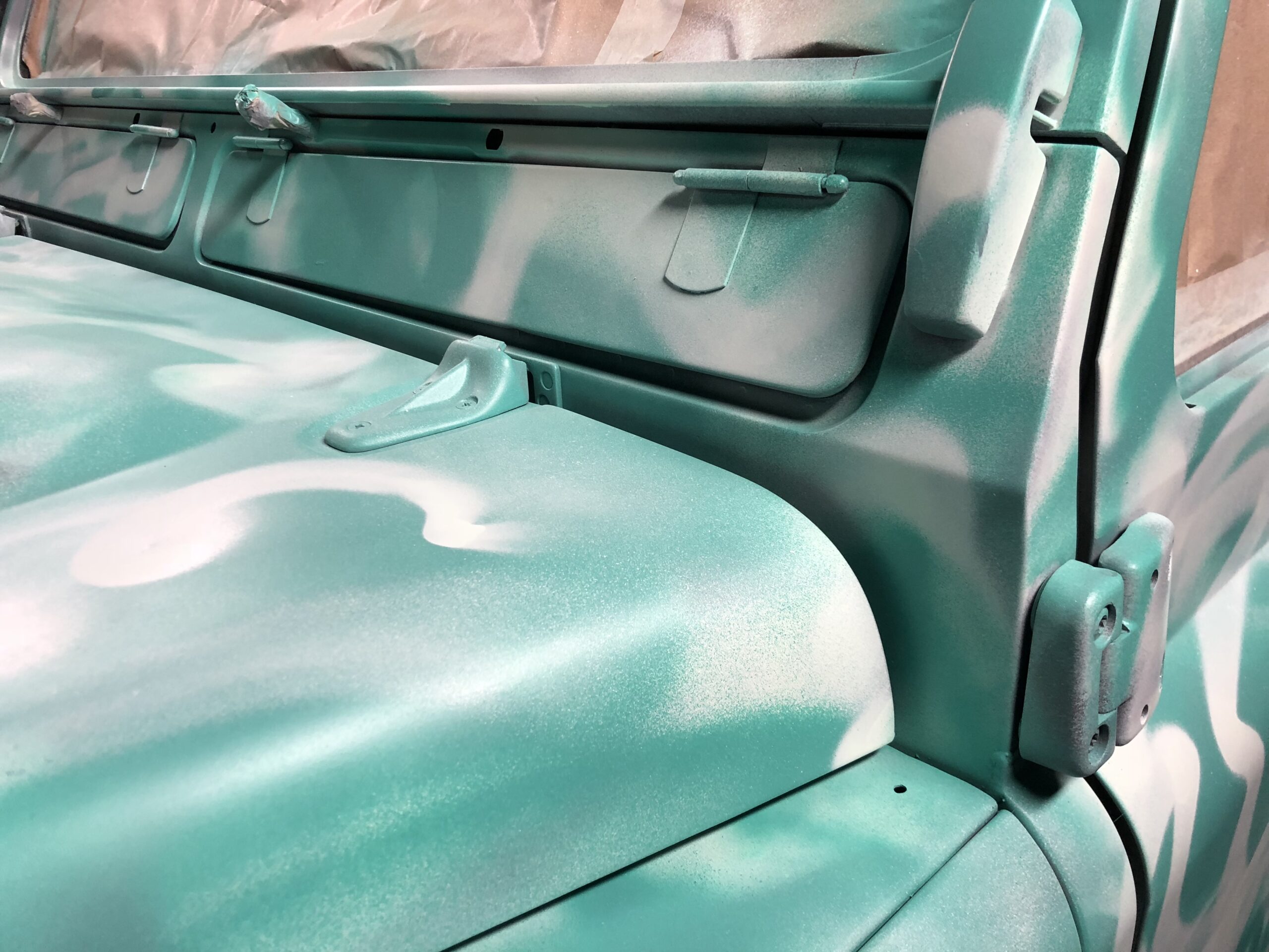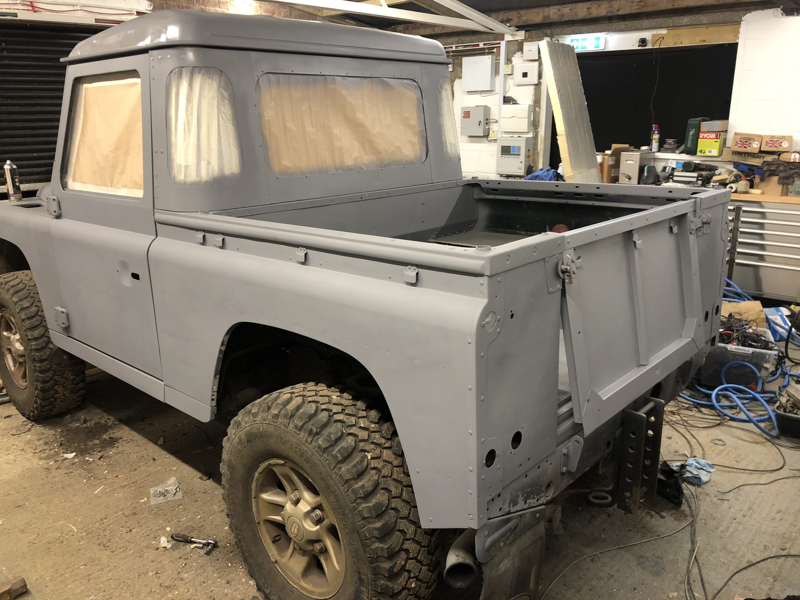 I started with an amazing condition donor vehicle. Interior and exterior completely stripped, sanded, primed, sanded and, then primed again and masked up, ready for its splash of colour.