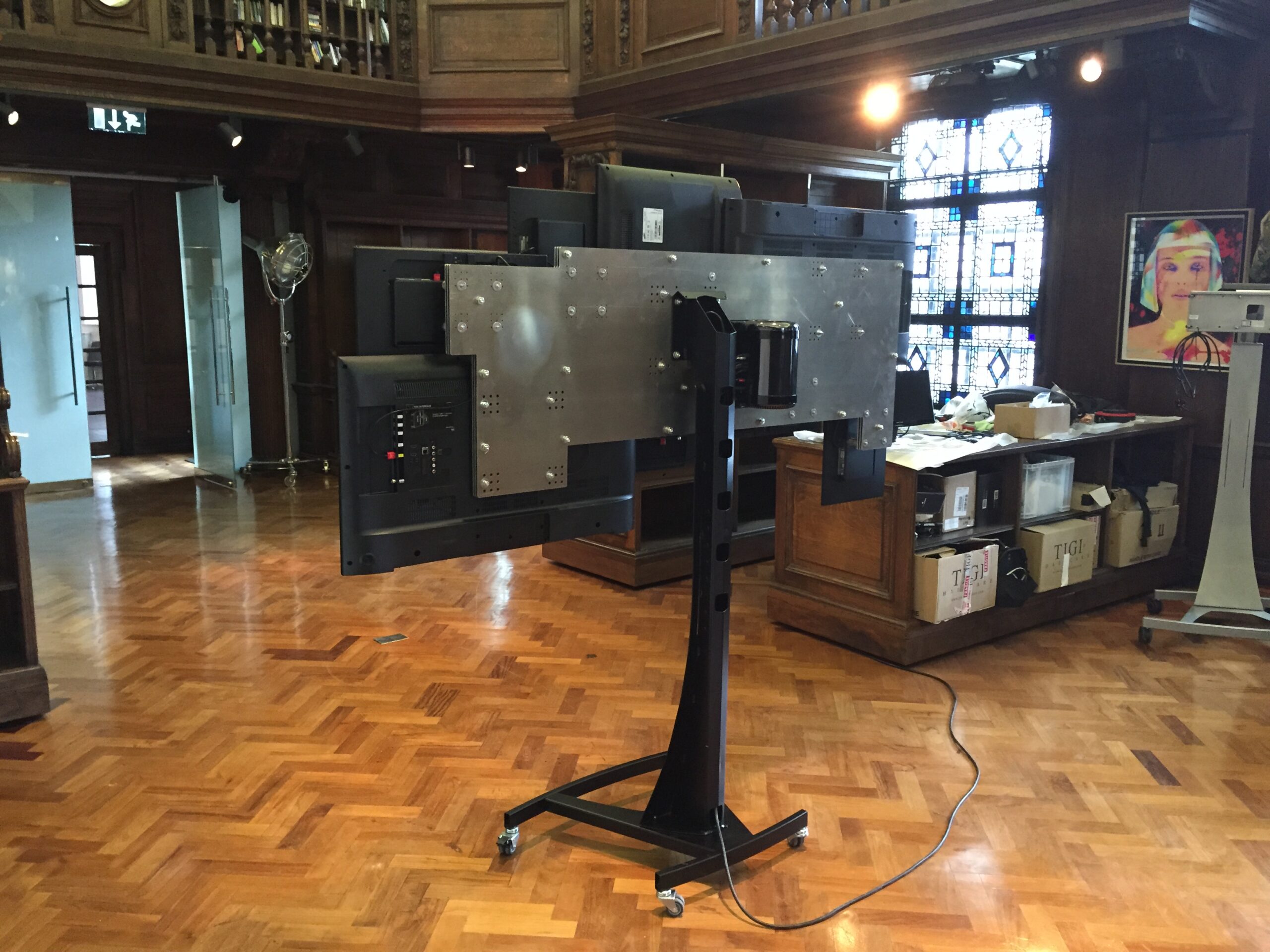 Multi screen mapped (V2) Second one commissioned by Anthony Mascolo for his private library in Battersea. Created from three CAD designed and plasma cut, 5mm thick aluminium plates. Custom Mac Pro mount and stand.